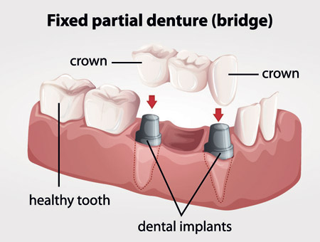A bridge is made up of two crowns for the teeth on either side of the space created by a missing tooth with a false tooth in between. A bridge replaces the missing tooth, both functionally and cosmetically. Bridge work is as much an art as it is an exact science. The materials used may be gold alloys, porcelain bonded to metal alloy, or all ceramic material. The choice of material depends on requirements for strength, wear, and/or esthetics.